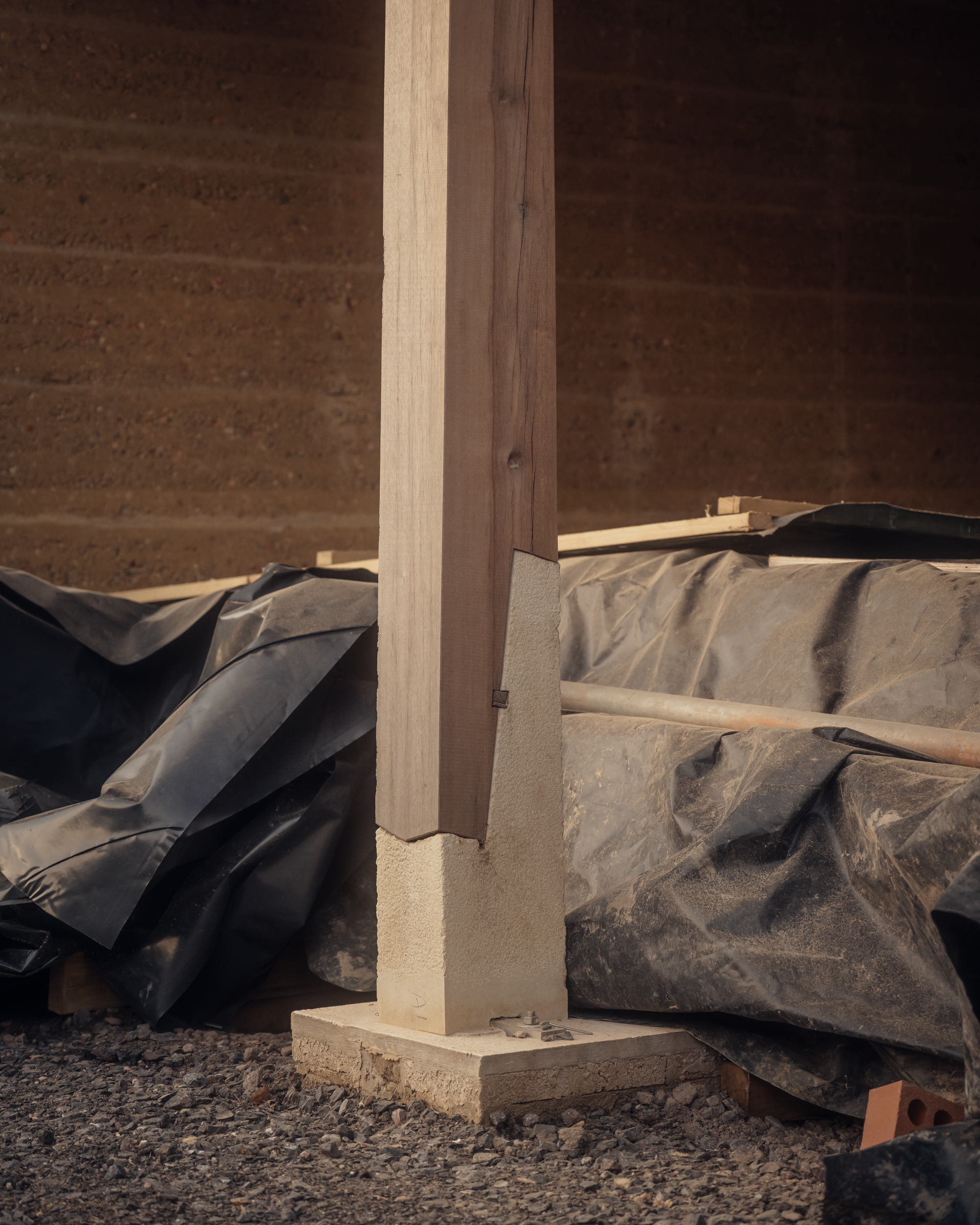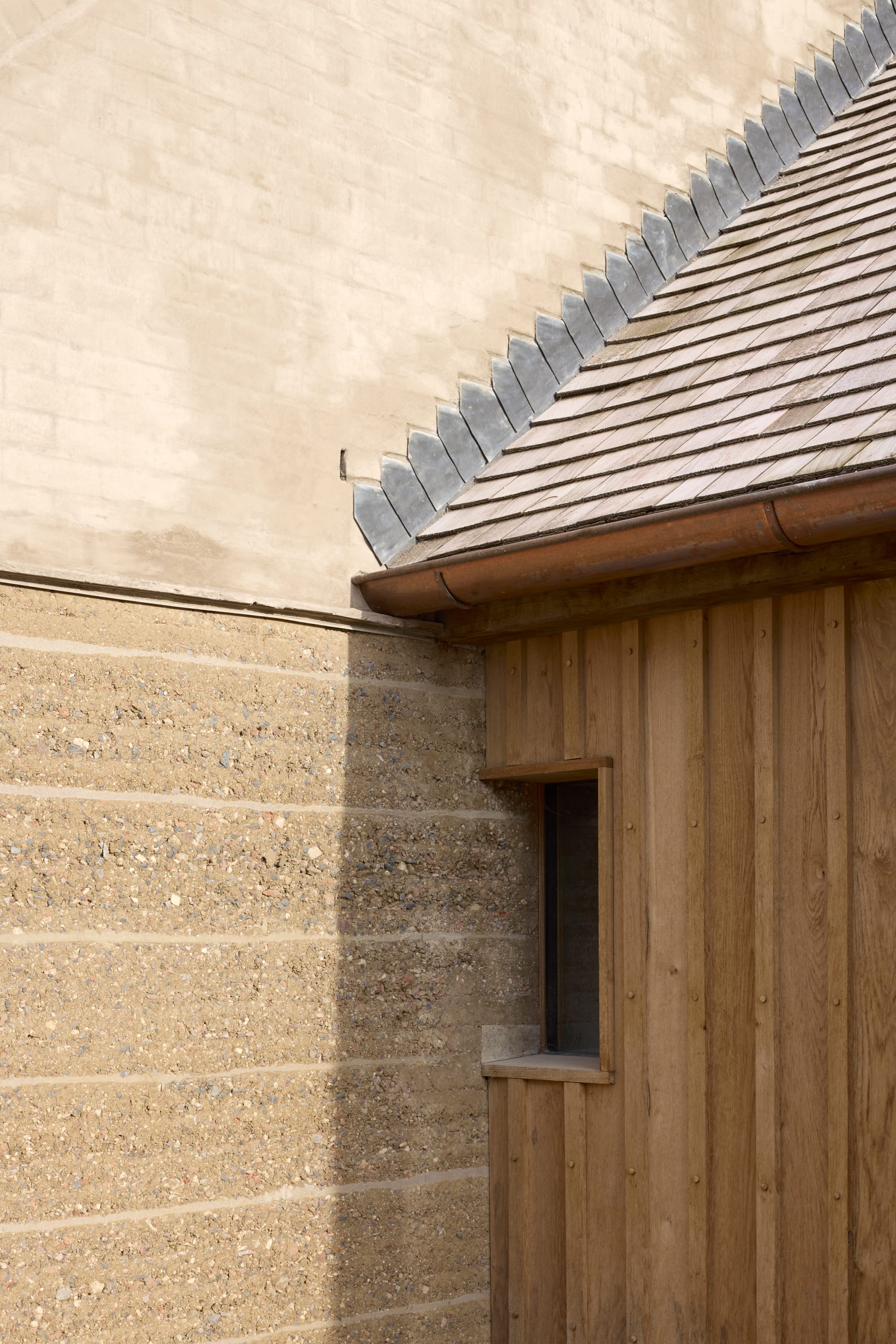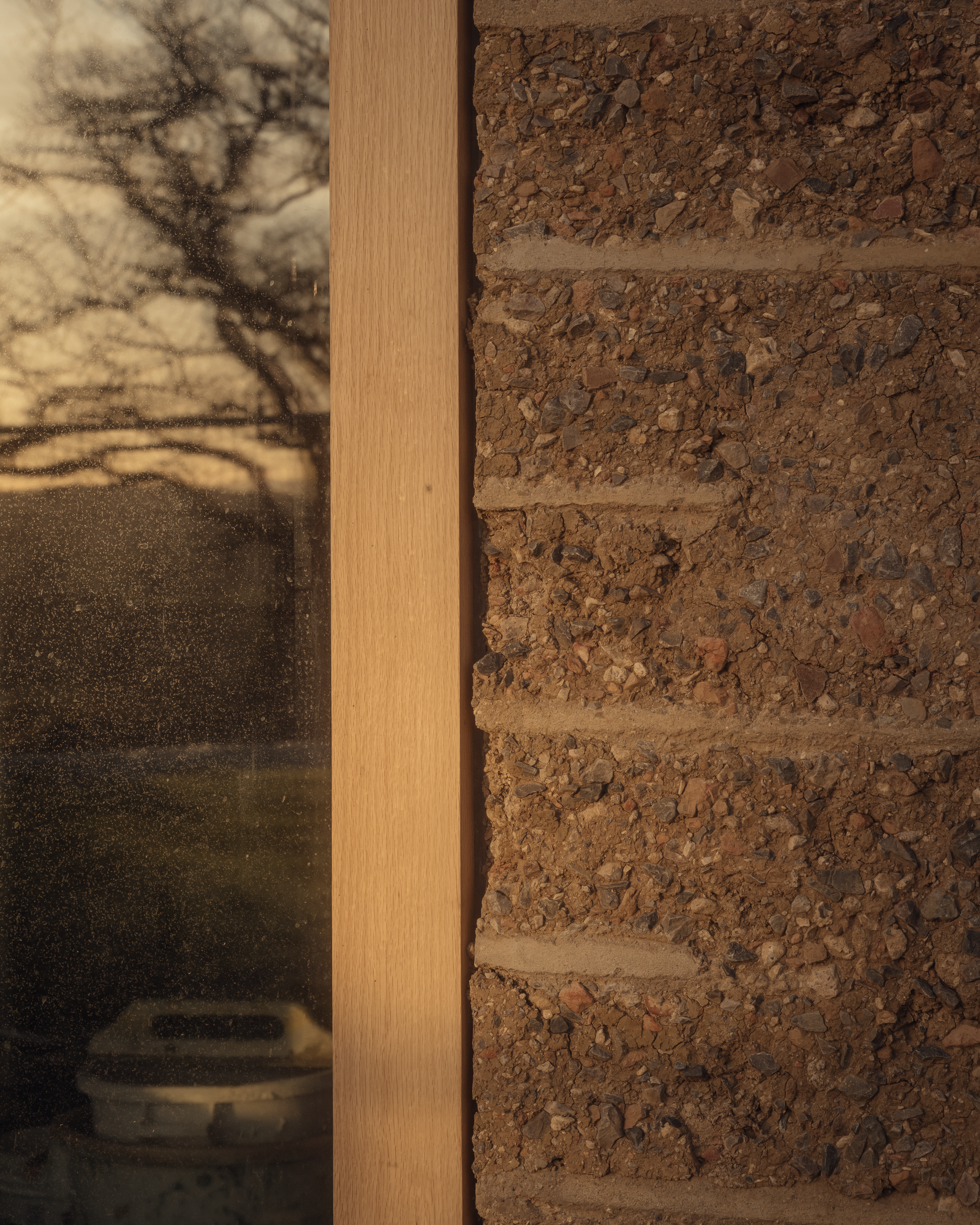 In a process driven by the practicalities of material availability, the team mixed equal parts of clay, crushed brick, concrete rubble, locally quarried limestone gravel and water to achieve structural strength without resorting to cement stabilisation. The site became a working quarry and laboratory: earth was sifted, weighed, rammed, left to dry for weeks, then adjusted by touch. The colour of the rammed earth is determined by the aggregate with samples ranging from a pale, almost white to grey. The team chose an earthy, sandy mix. Rauch’s deep knowledge of working in rammed earth, gained over years of experimentation, informed the detailing: stratas of sharp sand and lime mortar ‘speed checks’ arranged sequentially across the walls gently slows the rain. Overhanging brick gables protect the most vulnerable planes and a brick plinth prevents ground moisture from rising into the base.