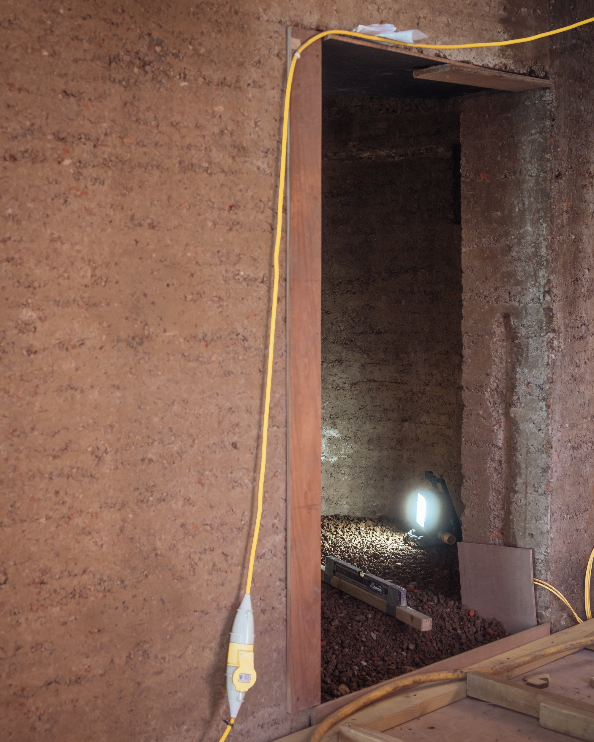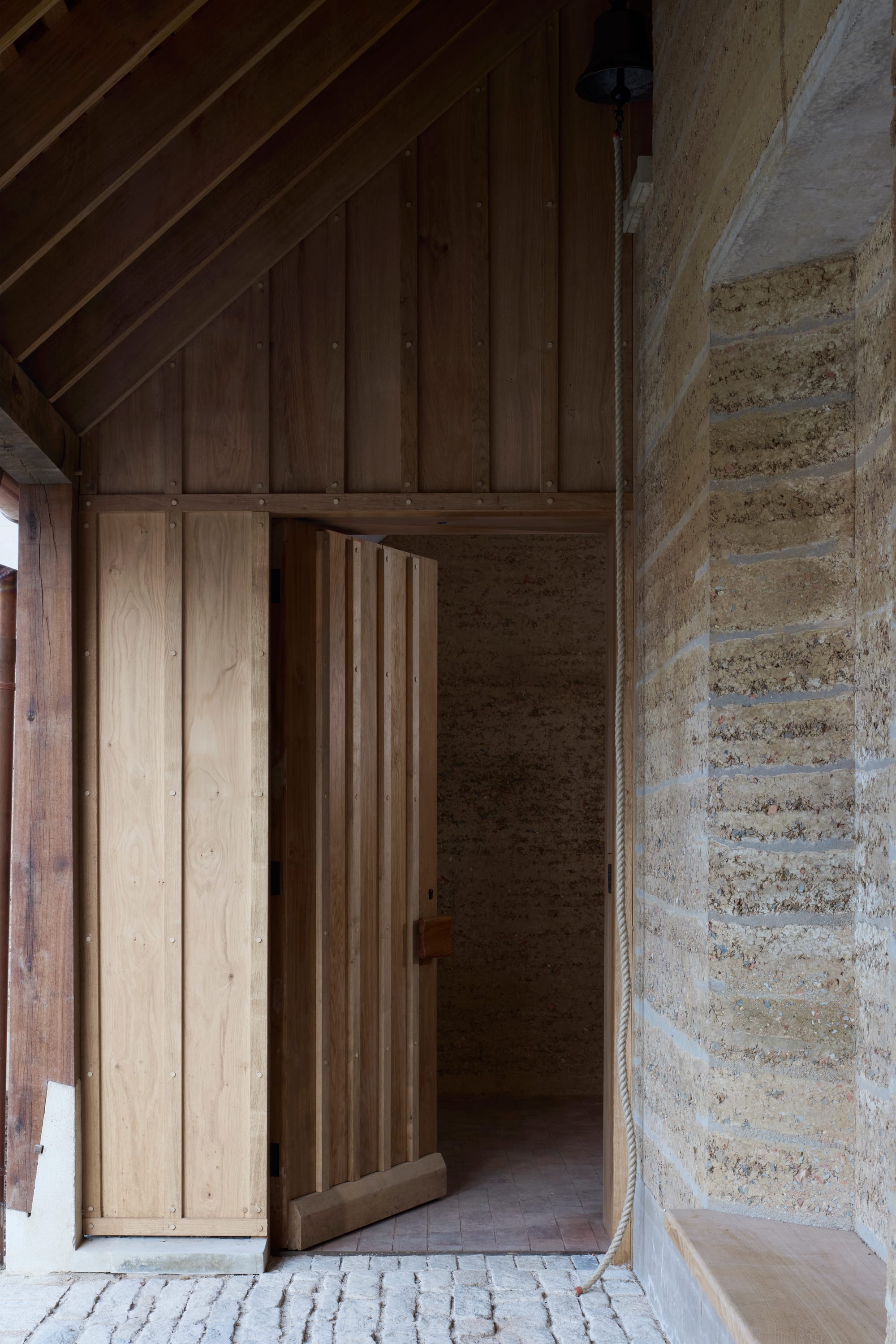 The site itself bears geological and industrial memory: once a 19th‑century brickworks, the practice’s research revealed that the good clay had long vanished, leaving imperfect deposits ideal for rammed earth. Victorian brick buildings were left in situ to be retrofitted by the practice as guest accommodation, while additions from the 1990s were demolished, creating the perfect aggregate for mixing with the clay. This paradox - where what is left behind proves most useful - sets the project’s tone. Material economy was both a necessity and ethos.
