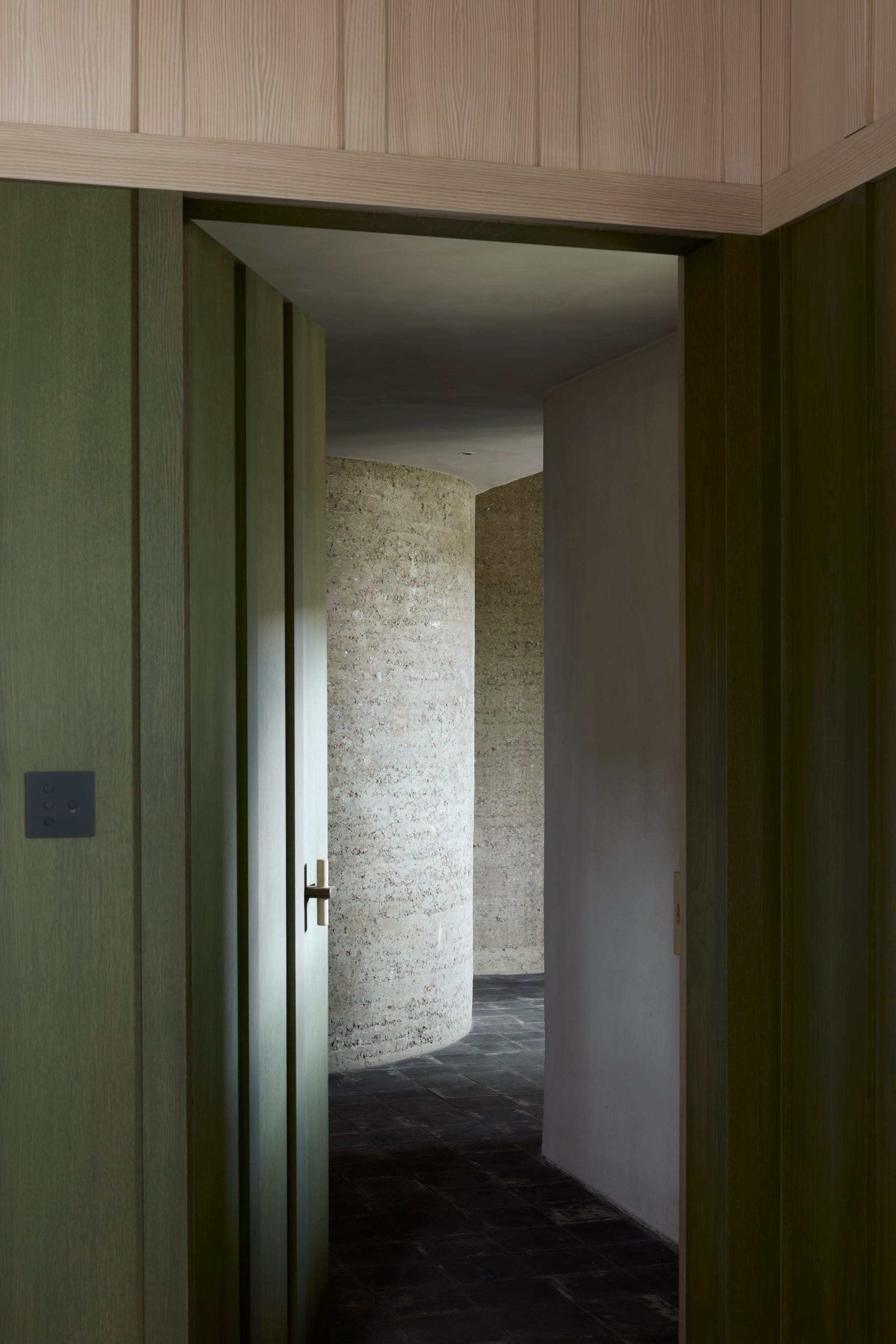 Inside, the light-filled house feels part excavation, part refuge. The rammed earth surface retains the archaeology of making, showing traces of shuttering, streaks from the compaction layers and subtle shifts of tone where batches meet. The walls’ thickness allows rooms to nest within their depth, with rafters embedded directly into the mass, and window reveals carved like grottoes. Breakout spaces and recesses punctuate circulation, creating moments for pause between rooms. Clayworks supplied Cornish clay plasters and lime finishes internally, while recycled wood fibre insulated the walls. A two‑storey curved staircase, rendered with a traditional milk‑based casein coating, twists upwards in a delicate counterpoint to the earth’s weight.