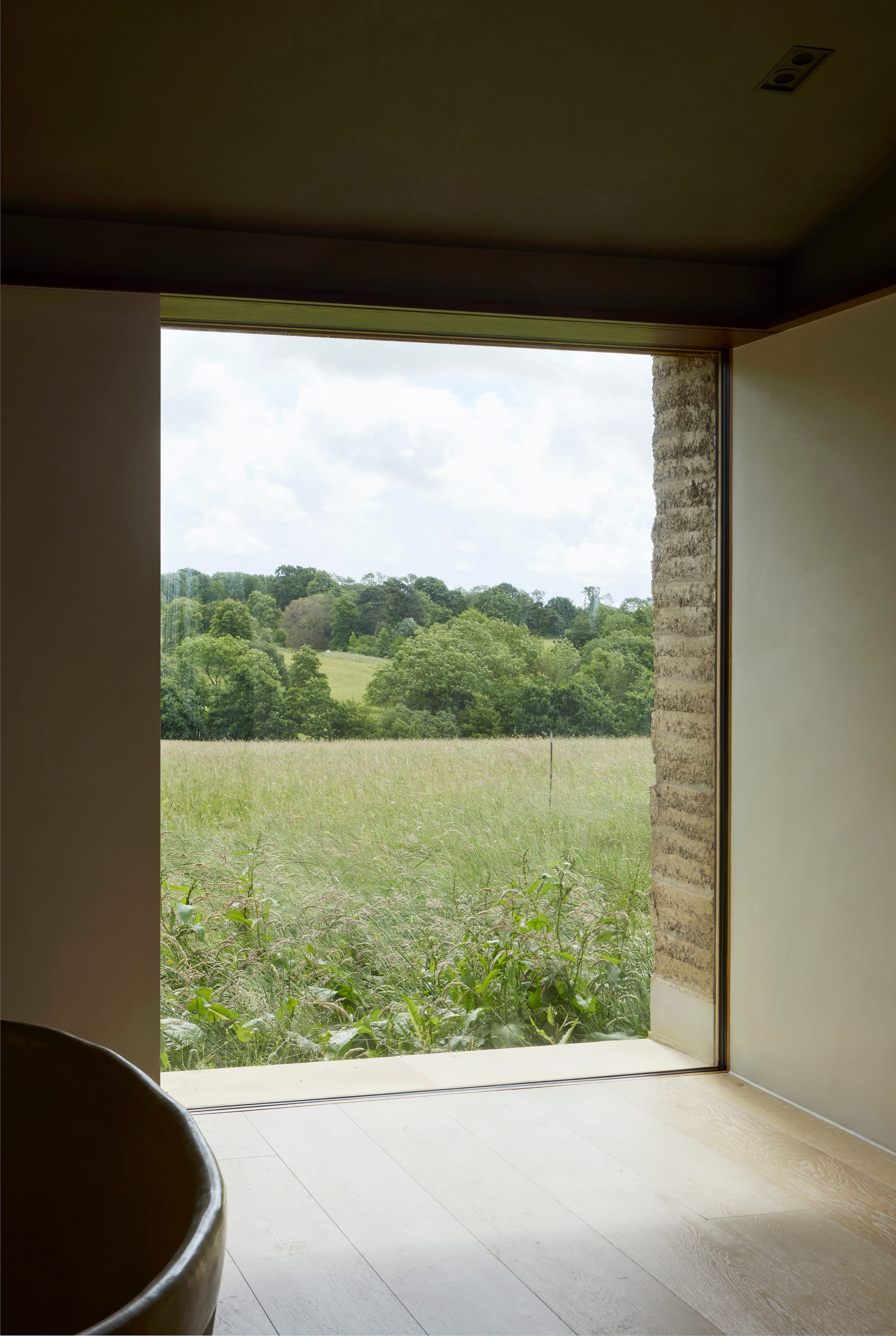 If the visible archeology of the walls are testament to the project’s collaborative craftsmanship, the material choices throughout illustrate the skill of trades turned experimenters. Timber specialists refined the use of oak externally, Douglas fir internally and walnut in the kitchen. Hardwearing greenheart wood - salvaged from disused coastal piers - form columns pegged into stone bases. Roofs are clad in cedar shingles and copper downpipes gleam like instruments against the walls. Chicksgrove limestone sills and lime-concrete mix lintels provide careful capillary breaks, protecting the unstabilised mix from moisture.