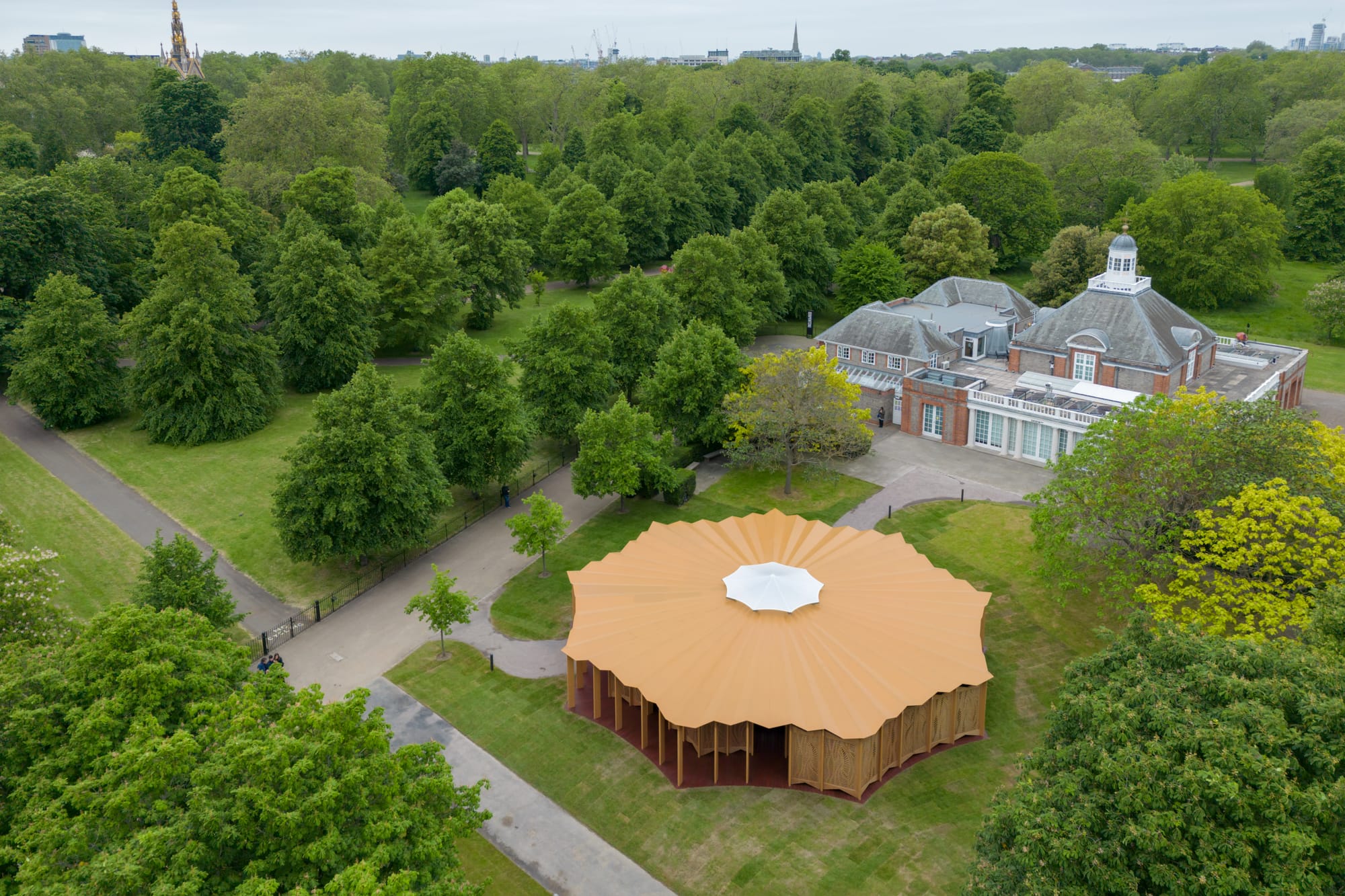 Serpentine Pavilion London, United Kingdom. Serpentine Pavilion 2023 designed by Lina Ghotmeh. © Lina Ghotmeh — Architecture. Photo: Iwan Baan, Courtesy: Serpentine.